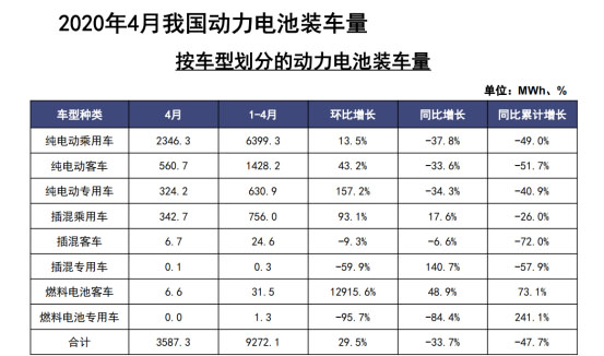 從動力電池裝車量來看,2020年4月,我國動力電池裝車量為3.6GWh,同比2019年4月的5.4GWh下降了33.7%,降幅有所收窄,環(huán)比2020年3月的2.8GWh上升29.5%。此外,2020年1-4月,我國動力電池裝車量累計為9.3GWh,同比累計下降47.7%。