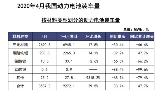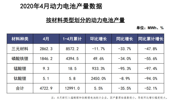 此外,2020年1-4月,我國三元電池產量累計為8.6GWh,占總產量66.0%,同比累計下降47.8%;磷酸鐵鋰電池產量累計為4.4GWh,占總產量33.8%,同比累計下降55.6%。
