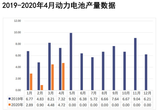 2020年4月,我國動力電池產量共計4.7GWh,環(huán)比3月的4.5GWh上升了5.5%,同比2019年4月的7.3GW下降了35.5%。此外,2020年1-4月,我國動力電池產量累計13.0GWh,同比累計下降52.1%。