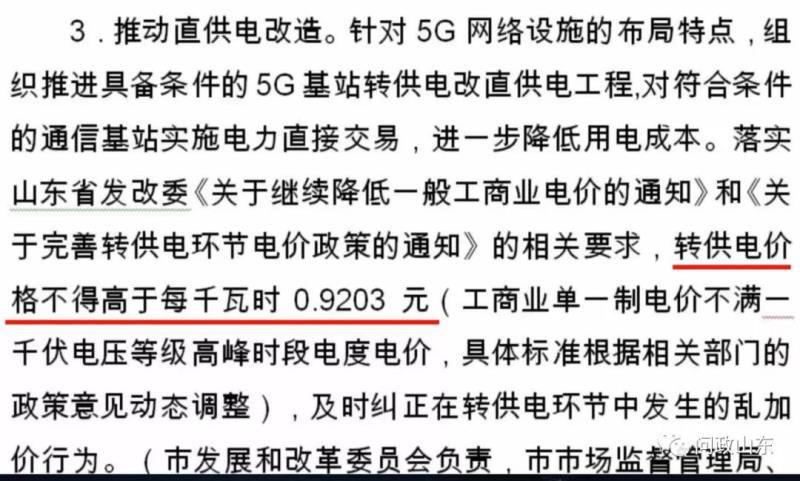 5G基站用電類型屬于非高耗能行業(yè)電用戶,今年2月山東省發(fā)改委《關(guān)于階段性降低工商業(yè)用電價格支持企業(yè)復(fù)工復(fù)產(chǎn)的通知》中指出:此類用戶計(jì)收電費(fèi)時,轉(zhuǎn)供電單位收費(fèi)標(biāo)準(zhǔn)不得高于每千瓦時0.8743元。今年3月份煙臺發(fā)布關(guān)于加快5G產(chǎn)業(yè)發(fā)展的實(shí)施意見征求意見函,其中也明確:轉(zhuǎn)供電價格不得高于每千瓦時0.9203元。