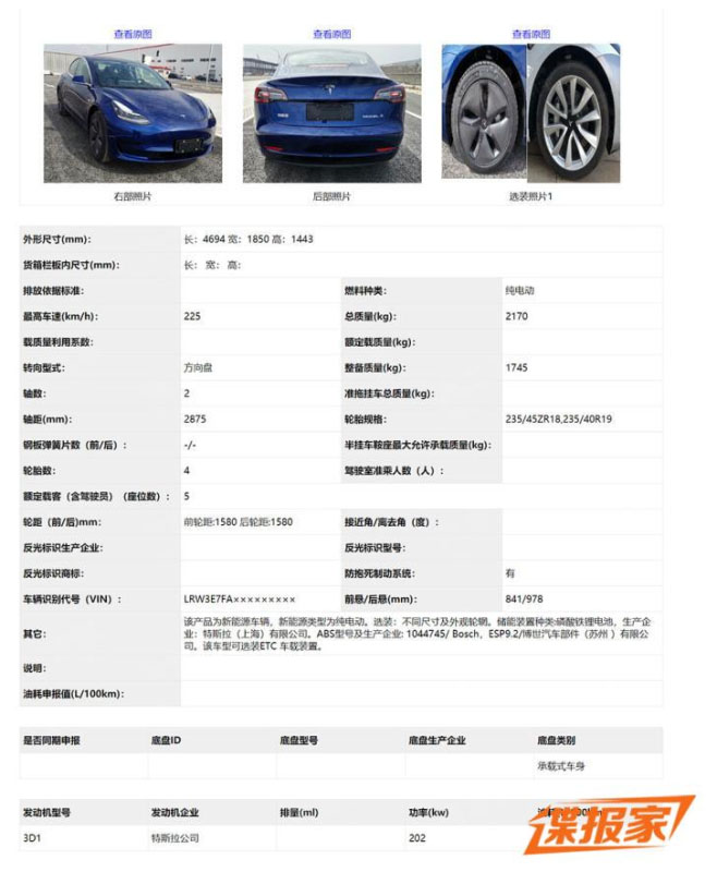 從申報(bào)圖來看,特斯拉Model 3的外觀并未發(fā)生變化;申報(bào)信息一欄中,車身長(zhǎng)寬高尺寸分別為4694mm/1850mm/1443mm,軸距為2875mm,新車電動(dòng)機(jī)型號(hào)為3D1,最大功率為202kW,均與現(xiàn)款車型保持一致。