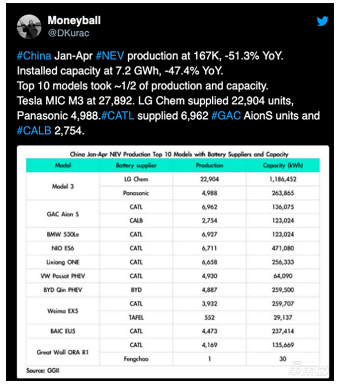 根據(jù)數(shù)據(jù)顯示,LG化學和松下都在為國產(chǎn)特斯拉進行電池的供應,在今年的前四個月中,LG化學和松下為特斯拉提供了1.45GWh的動力電池。