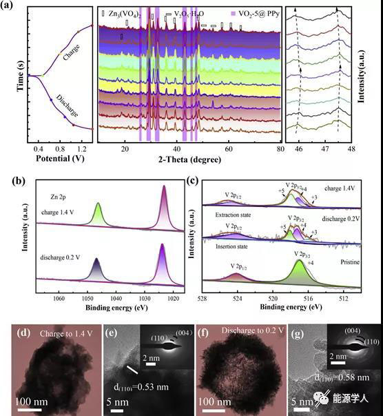 圖6(a)在充電/放電狀態(tài)下不同位點(diǎn)XRD圖(b,c)樣品XPS(d,e)充電1.4 V時(shí)TEM(f,g)放電0.2 V時(shí)TEM