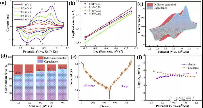 圖5(a)不同掃描速率下的CV曲線(b)從CV掃描中提取的特定峰值電流下的log(i)和log(v)圖(c,d)表面電容與擴(kuò)散控制電極之間的貢獻(xiàn)比(e,f)首次充放電過程中GITT曲線以及陰極材料對應(yīng)的Zn2+擴(kuò)散系數(shù)與Zn2+/Zn的關(guān)系
