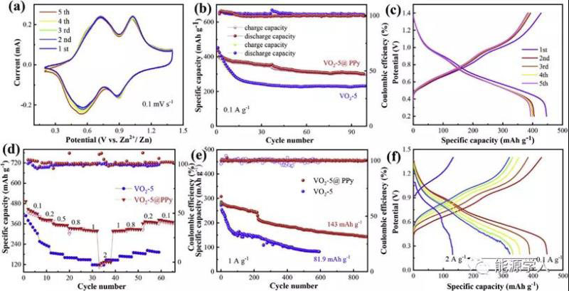 綜上所述,作者通過簡單的合成過程成功制備新穎的VO2-5@ PPy電極材料。通過調(diào)控實(shí)現(xiàn)了其從單斜相到四方相的轉(zhuǎn)變。制備的鋅離子電池展現(xiàn)了較高的比容量和優(yōu)異的倍率性能。