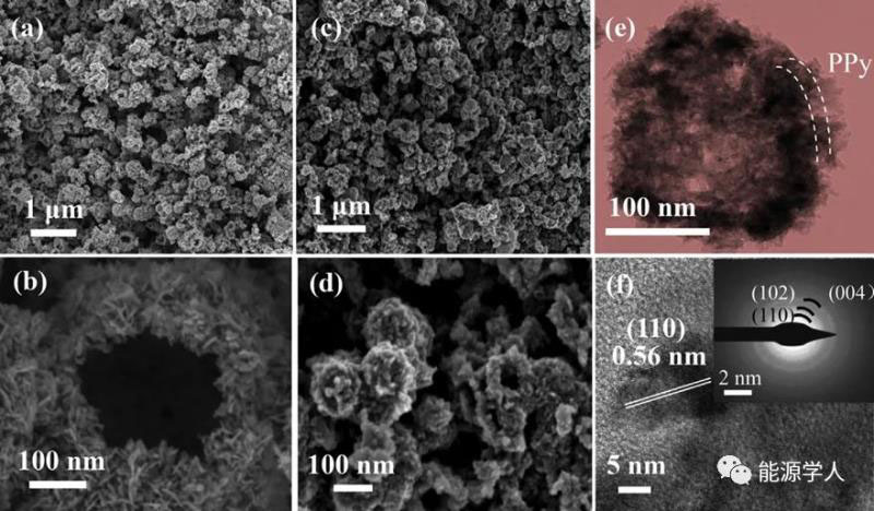 圖3形貌表征 (a, b) VO2-5樣品形貌 (c, d) VO2-5@PPy樣品形貌 (e, f) VO2-5@ PPy樣品TEM結(jié)構(gòu)