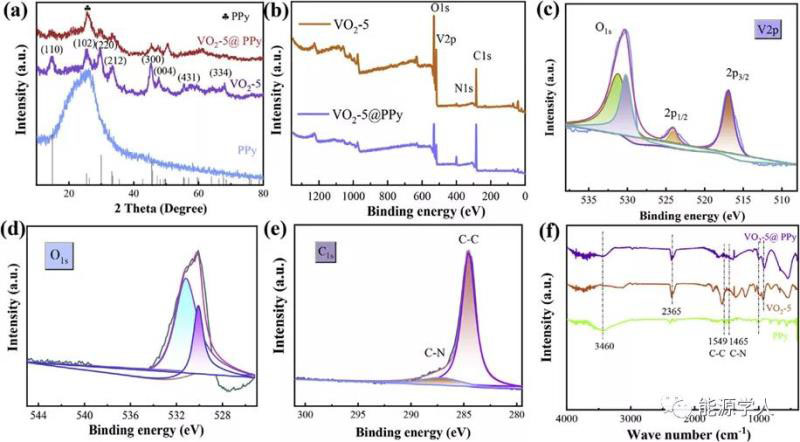 圖2結(jié)構(gòu)表征(a) XRD圖譜(b-e) XPS光譜總圖,V 2p, O 1s和C 1s (f) FTIR
