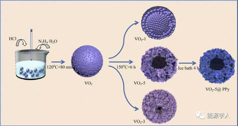 近日沈陽工業(yè)大學(xué)武祥教授團(tuán)隊(duì)和香港城市大學(xué)支春義教授合作報(bào)道了用作水系鋅離子電池正極材料的四方VO2空心球。他們首先通過調(diào)控鹽酸含量來優(yōu)化VO2樣品形貌。與此同時(shí),通過兩步加熱實(shí)現(xiàn)材料晶相從單斜向四方轉(zhuǎn)變。之后,為防止釩溶解在電解液中,同時(shí)提高VO2導(dǎo)電性,他們利用協(xié)同效應(yīng)在其表面包裹一層PPy薄膜。最后,構(gòu)建以VO2@PPy為正極,鋅箔為負(fù)極, Zn(CF3SO3)2作為電解液的鋅離子電池,展現(xiàn)出優(yōu)異的倍率性能。在 0.1 A g-1時(shí),其比容量為440 mAh g-1。當(dāng)電流密度增加到1 A g-1時(shí),經(jīng)過860次循環(huán)后,電池仍能保持143 mAh g-1的可逆容量。相關(guān)成果以題為“Tetragonal VO2 hollow nanospheresas robust cathode material for aqueous zinc ion batteries”發(fā)表在能源領(lǐng)域著名期刊Materials Today Energy (2020, 17,100431)上。2019級博士研究生劉穎同學(xué)為該論文的第一作者。