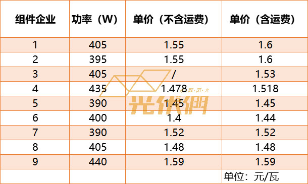 大多數(shù)企業(yè)的含運費價格在1.55元/W以內(nèi),最低甚至低至1.44元/W!具體如下表所示: