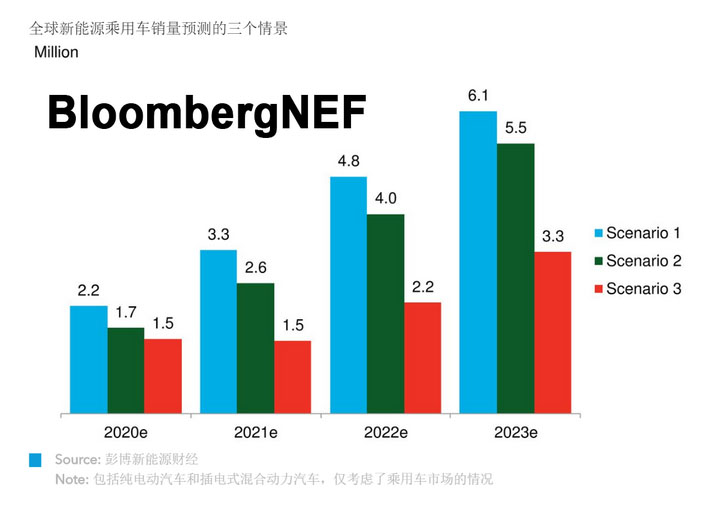 情景一是目前是最樂觀的情景。在此情景下,2020年全球新能源汽車銷量實際增長約3%;在政府出臺有力的應對政策、市場對新能源汽車新車型需求持續(xù)增長的作用下,汽車市場得以迅速恢復。新冠疫情對2020年以后的新能源汽車銷量影響非常有限,2023年的新能源汽車銷量預計達到610萬輛。