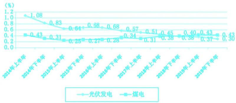 我國光伏的平均度電成本已經(jīng)低于全國煤電的平均度電成本。從2014年開始,全球最大的財經(jīng)資訊服務提供商彭博資訊集團(Bloomberg L.P.),每年分兩次對多個國家和地區(qū)的光伏度電成本進行統(tǒng)計測算。結(jié)果顯示:我國光伏平均度電成本從2014年上半年的1.08元/千瓦時降至2019年下半年的0.3元/千瓦時,降幅約為72%。從2018年下半年開始,我國光伏平均度電成本降至0.38元/千瓦時,已經(jīng)低于煤電的平均度電成本0.40元/千瓦時。詳見圖1。