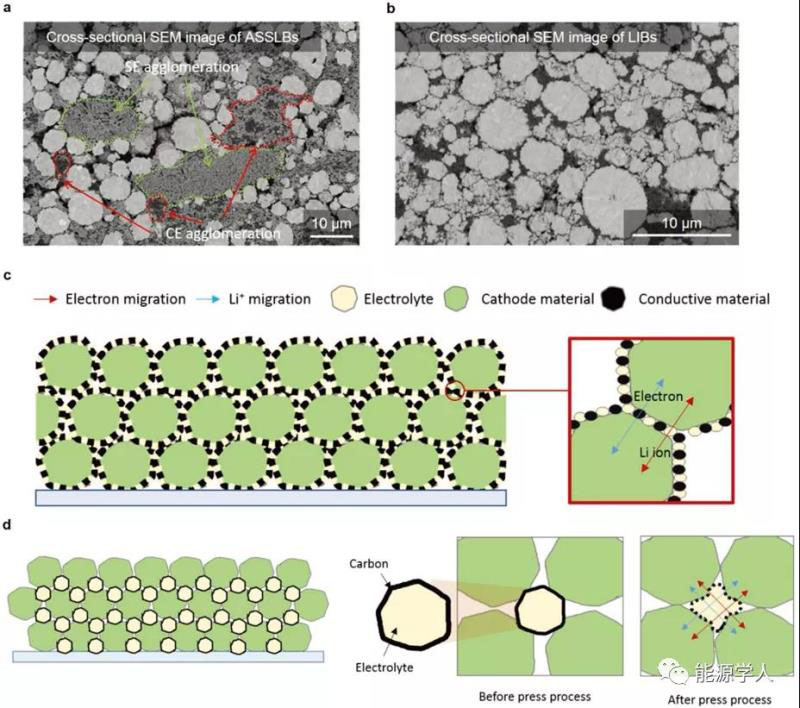 電極內(nèi)的電子電導(dǎo)率在提高ASSLBs容量和功率特性方面起著至關(guān)重要的作用。圖3a,b顯示了ASSLBs和傳統(tǒng)液體LIBs的電極橫截面SEM??梢钥闯觯珹SSLBs電極內(nèi)的導(dǎo)電材料(CMs)在某些地方嚴(yán)重聚集,而傳統(tǒng)LIBs電極的CMs具有良好的分散性。此外,由于SE和活性材料之間的高界面電阻,大多數(shù)ASSLBs電極都是用高比例的電解質(zhì)制成的,這些電解質(zhì)是電子絕緣體。因此,與傳統(tǒng)的液體LIBs相比,ASSLBs的電子電導(dǎo)率可能不夠。因此,即使提高電極的鋰離子電導(dǎo)率,ASSLBs也會(huì)由于缺乏電子通路而無法發(fā)揮真實(shí)容量。因此,研究提高電子電導(dǎo)率的改進(jìn)方法是非常重要的。