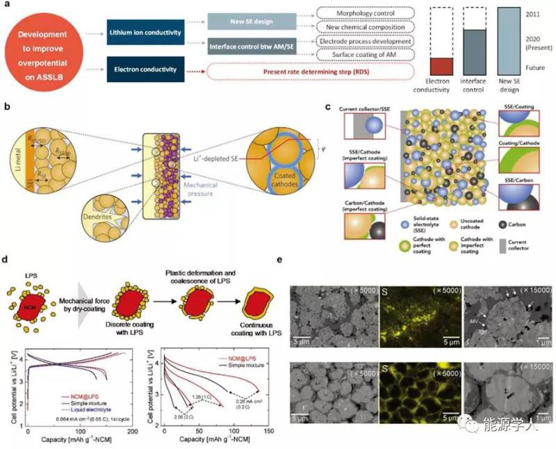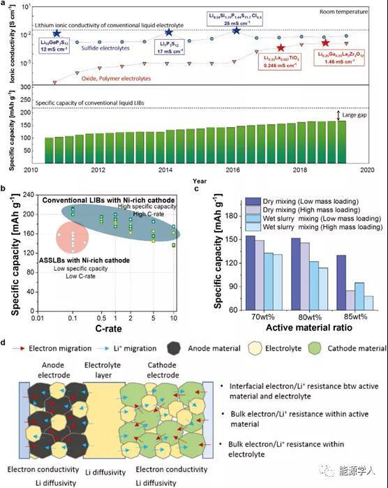 此外,如圖1b所示,傳統(tǒng)LIBs的電化學(xué)測試能夠以不同的倍率進(jìn)行,而大多數(shù)ASSLBs的測試只能以較低的倍率(0.1C)進(jìn)行。而且,作為決定能量密度關(guān)鍵因素的ASSLBs電極仍然面臨諸如活性材料比、負(fù)載水平和制造方法的挑戰(zhàn)。對于ASSLB,大多數(shù)先前的研究都采用了干混合電極制造方法,該方法由于其機(jī)械不穩(wěn)定性而不適用于大規(guī)模生產(chǎn)。而常規(guī)的液體LIBs采用濕漿料混合電極的制造方法,不僅適用于大規(guī)模生產(chǎn),還有利于形成良好的界面接觸。更重要的是,為了獲得高能量密度,大多數(shù)常規(guī)液體LIBs不僅增加了電極的活性物質(zhì)比例,而且提高了電極的負(fù)載。低比容量、低電流密度和溫和電極條件的挑戰(zhàn)阻礙了ASSLBs的實(shí)際應(yīng)用。此外,在ASSLBs中,鋰離子和電子要通過活性物質(zhì)、SEs以及活性物質(zhì)與SEs的界面,因此,活性材料和SE之間的界面電阻是不可避免的。為了解決這些關(guān)鍵問題,促進(jìn)ASSLBs的實(shí)際應(yīng)用,應(yīng)該將研究重點(diǎn)集中在降低ASSLBs的界面電阻和體電阻,并提高ASSLBs電極內(nèi)的離子和電子電導(dǎo)率上,這是容量和功率密度的關(guān)鍵因素。