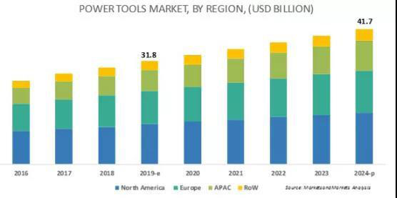行業(yè)數(shù)據(jù)顯示,2019年全球電動(dòng)工具市場(chǎng)規(guī)模318億美元(約合人民幣2252億元),按照年復(fù)合增長(zhǎng)率5.5%計(jì)算,到2024年,全球電動(dòng)工具市場(chǎng)規(guī)模將達(dá)到417億美元(約合人民幣2953億元)。