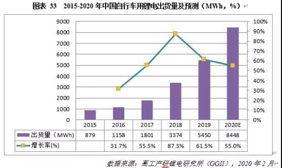 高工產(chǎn)研鋰電研究所(GGII)數(shù)據(jù)顯示,受下游需求強(qiáng)勢(shì)拉動(dòng),2019年中國(guó)自行車用鋰電池出貨量達(dá)5.450GWh,同比增長(zhǎng)61.5%。預(yù)計(jì)2020年將提升至8.448GWh,同比增長(zhǎng)55%。