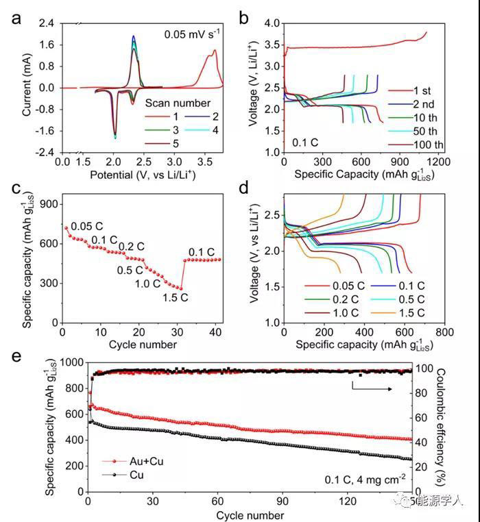 圖5.(a-d)Li2S||Au/Cu全電池的CV曲線、倍率性能及其相應的充放電曲線;(e)Li2S||Au/Cu全電池和Li2S||Cu全電池長循環(huán)性能對比。