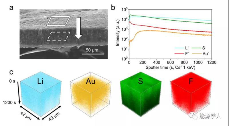 圖4.(a)首圈充電鋰沉積的截面SEM圖像;(b)Li-、S-、F-、Au-粒子的飛行時間-二次離子質(zhì)譜的深度曲線;(c)相應粒子的三維圖像。