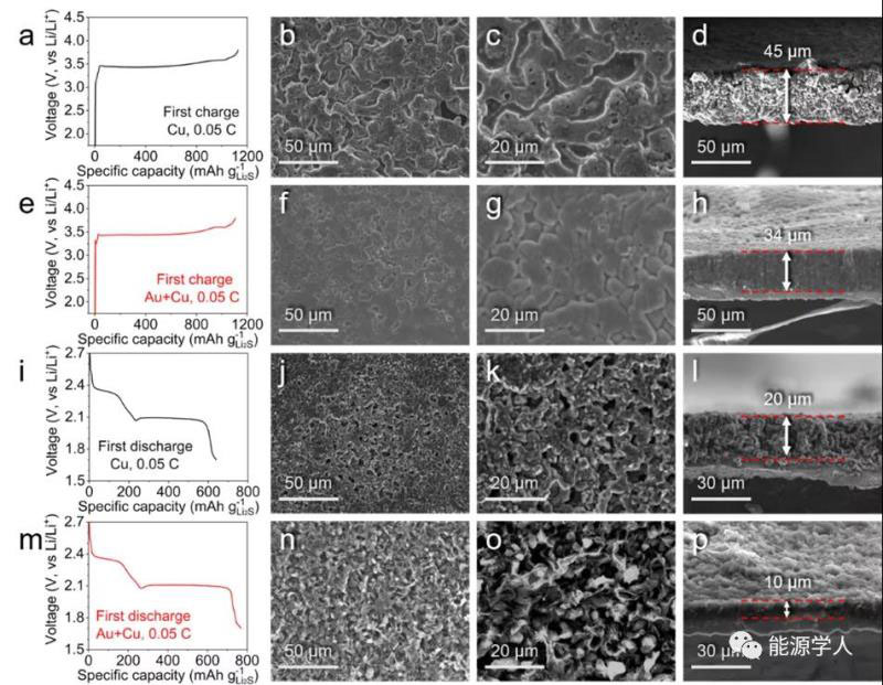 圖3. Li2S||Cu和Li2S||Au/Cu全電池的首圈充放電曲線及其負極的SEM圖像。