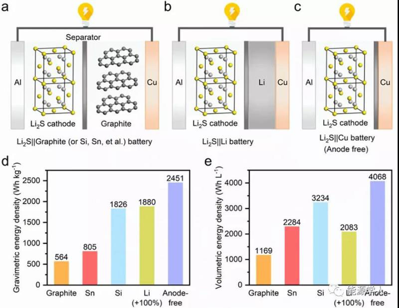 圖1.(a-c)Li2S||石墨 (或者 Si, Sn, 等),Li2S||Li,Li2S||Cu(無鋰負極)全電池示意圖;(d-e)Li2S||石墨、Li2S||Sn、Li2S||Si、Li2S||Li(+100%)和Li2S||無鋰負極全電池的理論質(zhì)量能量密度和體積能密度。