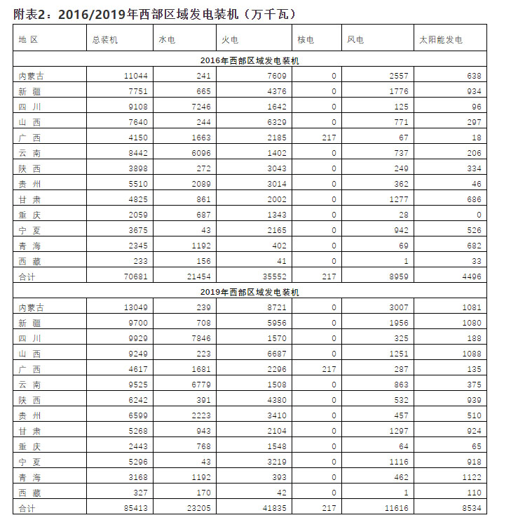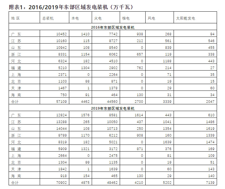 1、 從發(fā)電裝機(jī)全國占比看,與2016年相比,2019年各區(qū)域發(fā)電裝機(jī)在全國的占比變化不大,東部和中部占比略增,西部和東北略降。
