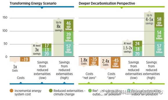 2、加快可再生能源部署和提高能效回報將遠大于投入。按照“轉(zhuǎn)型能源情景”,能源轉(zhuǎn)型每花費1美元,將獲得3-8美元的投資回報(圖5)。換言之,到2050年“轉(zhuǎn)型能源情景”將增加19萬億美元的成本,但通過降低環(huán)境和健康損害,將獲得50-142萬億美元的回報。要實現(xiàn)凈零排放,“更深度脫碳情景”將需再增加16萬億美元投入,如果實現(xiàn)完全無排放則將增加26萬億美元成本,但零碳排放帶來的收益將達到62-169萬億美元。另一種衡量成本的方法是在此期間減少一噸碳排放的成本。對于“轉(zhuǎn)型能源情景”,該成本為34美元/噸,對于“更深度脫碳情景”凈零排放,成本為100美元/噸,對于“更深度脫碳情景”完全零排放,成本為156美元/噸。