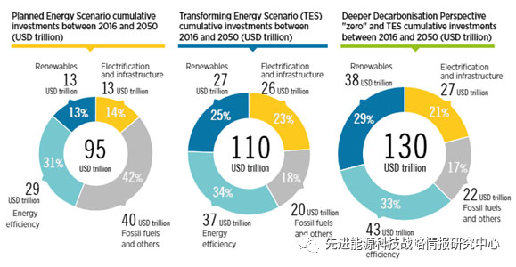 1、為了確保氣候安全,需要擴大對清潔能源技術(shù)的投資并轉(zhuǎn)變投資方向。需要將化石燃料投資轉(zhuǎn)向可再生能源和能效,逐步取消化石燃料補貼。到2050年,“轉(zhuǎn)型能源情景”中能源系統(tǒng)總投資需要達到110萬億美元,約占同期年均GDP的2%。其中,超過80%的資金應(yīng)投資可再生能源、能效、終端用能電氣化以及電網(wǎng)和靈活性。如果以年度計算,每年的投資水平應(yīng)達到約3.2萬億美元。相比之下,2014-2018年期間平均每年的投資約為1.8萬億美元,而在“已規(guī)劃能源情景”下未來將達到2.9萬億美元/年。如果希望實現(xiàn)“零碳排放”,到2050年對能源系統(tǒng)總投資需要達到130萬億美元(見圖4)。