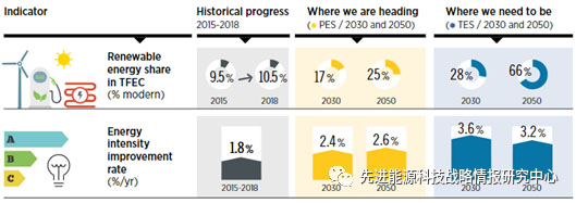 4、作為降低碳排放的主要解決方案,能效和可再生能源需加速部署。能效和可再生能源是實現(xiàn)全球能源轉(zhuǎn)型的兩個關(guān)鍵解決方案。然而,由于能源需求持續(xù)增長,2010年以來可再生能源在全球終端能源消費中所占的份額僅在10%左右緩慢增長。2019年能源強度僅增長1.2%,低于過去十年的平均水平(1.8%)。按照“轉(zhuǎn)型能源情景”,可再生能源、能效和電氣化將共同貢獻90%的能源相關(guān)減排量,可再生能源在終端能源消費占比到2030年應(yīng)增至28%,到2050年需達到66%,而能源強度改善速度需提高到每年3.2%,才能滿足全球氣候目標(biāo)(圖3)。