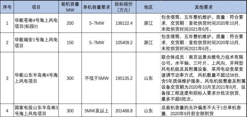 5月22日,華能集團發(fā)布2個海上風電項目中標公示,遠景能源以243531.60萬元中標,單機要求5-7MW,均包含塔筒、五年整機維護。其中華能蒼南4號海上風電項目(標段II)裝機容量200MW,華能瑞安1號裝機容量150MW。