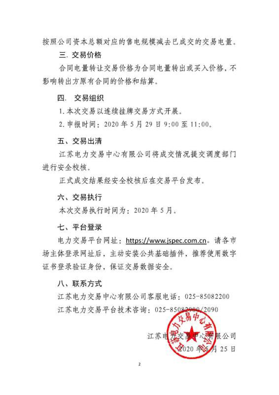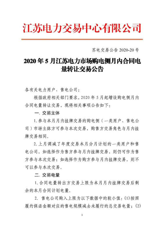 2020年5月江蘇電力市場購電側(cè)月內(nèi)合同電量轉(zhuǎn)讓交易公告