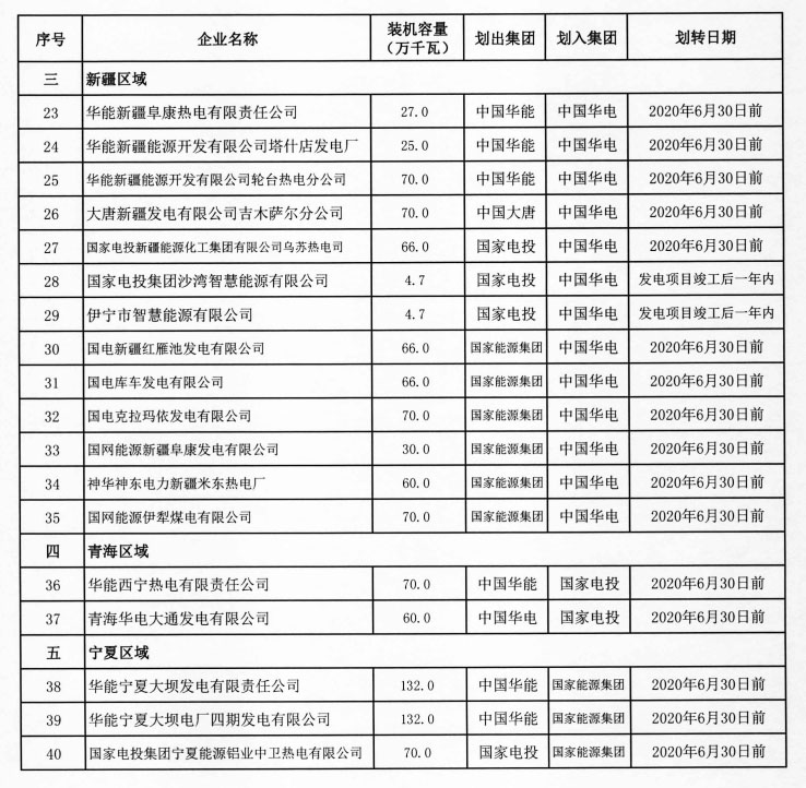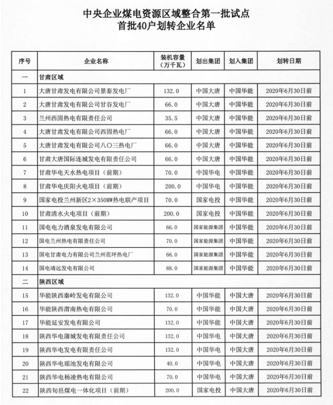 《通知》的下發(fā)對(duì)象是華能、大唐、華電、國(guó)家電投和國(guó)家能源集團(tuán)這五家主要的發(fā)電央企。根據(jù)《通知》,五大發(fā)電央企下屬的西北區(qū)域甘肅、陜西、新疆、青海、寧夏五省區(qū)的48戶煤電企業(yè)已就整合達(dá)成一致,其中40戶將劃轉(zhuǎn),8戶暫不劃轉(zhuǎn)。劃轉(zhuǎn)的40戶煤電企業(yè)中,38戶要求在2020年6月30日前完成劃轉(zhuǎn),2戶在建項(xiàng)目在竣工后一年內(nèi)劃轉(zhuǎn)。