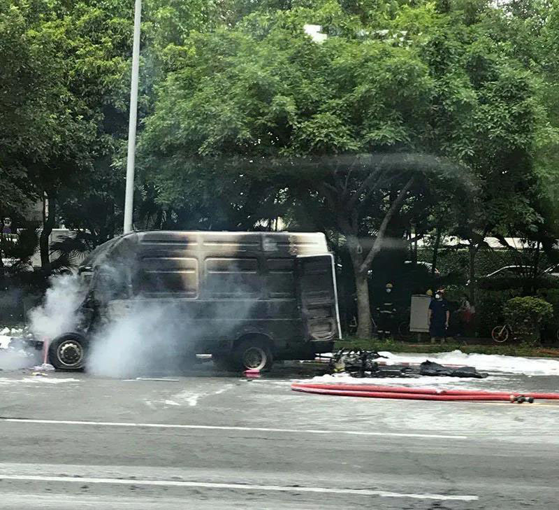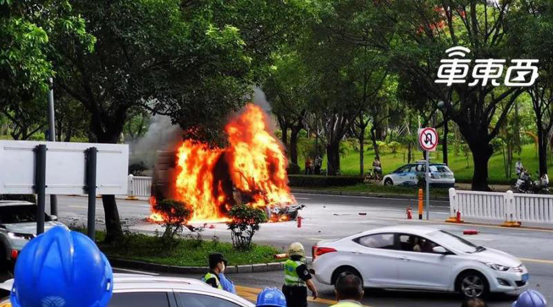起火應(yīng)該是車(chē)頭追尾校車(chē)所致,但從視頻看,起火部位在車(chē)輛底部,極有可能是動(dòng)力電池?zé)崾Э睾蟀l(fā)生大火。從現(xiàn)場(chǎng)的畫(huà)面來(lái)看,在交警采用了干粉滅火器進(jìn)行滅火后,火勢(shì)絲毫沒(méi)有減弱。