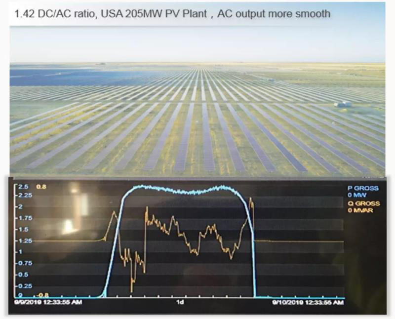 下圖是陽光電源在美國一個205MW實際電站的日輸出功率曲線,該電站采用1.42倍容配比+跟蹤系統(tǒng)設(shè)計。由圖可見,逆變器從早上8:00點到下午17:00一直處于滿功率運行狀態(tài),相比于傳統(tǒng)光伏電站拋物線型的發(fā)電曲線,該電站的發(fā)電功率曲線更為平滑,整個光伏電站的輸出更加穩(wěn)定,大大提高了電網(wǎng)友好性。