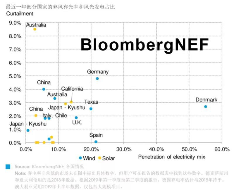 圖表:最近一年部分國家的棄風(fēng)棄光率和風(fēng)光發(fā)電占比(來源:彭博新能源財經(jīng))