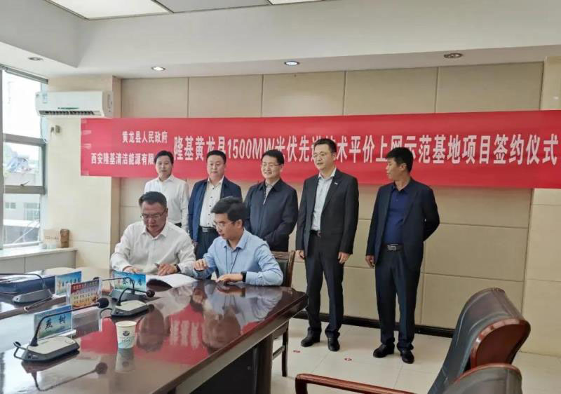 近日,隆基黃龍縣1500MW光伏先進技術平價上網(wǎng)示范基地項目簽約儀式在陜西省延安市黃龍縣政府舉行。黃龍縣縣長李富榮、常務副縣長崔紅德、西安隆基清潔能源有限公司(以下簡稱“隆基清潔能源”)董事長張長江、技術支持總監(jiān)李歡東及雙方相關部門負責人出席了簽約儀式。