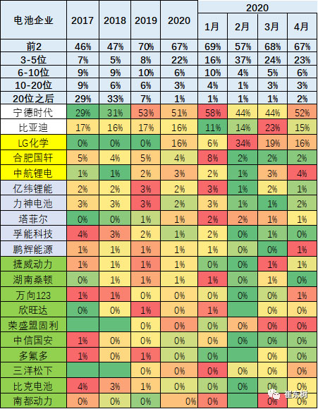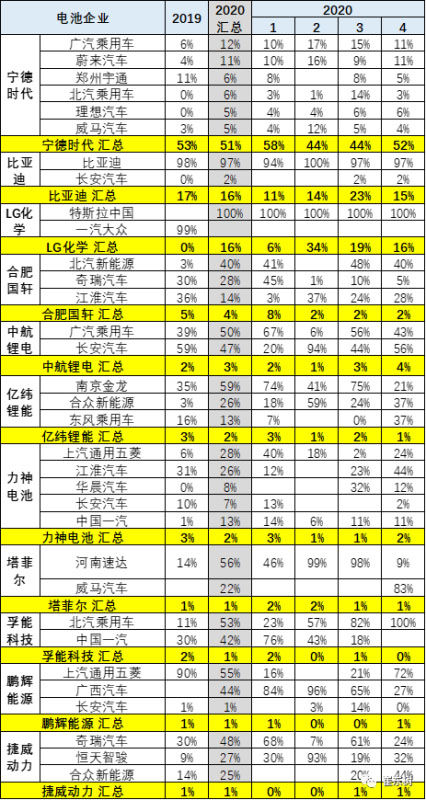 由于前兩位的裝機增長,3~5位的電池企業(yè)份額相對下降,從2018年的5%上升到2019年的8%,主要是松下和LG的電池進入較強,其他的中間企業(yè)下降幅度目前不大。