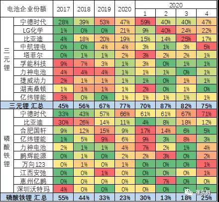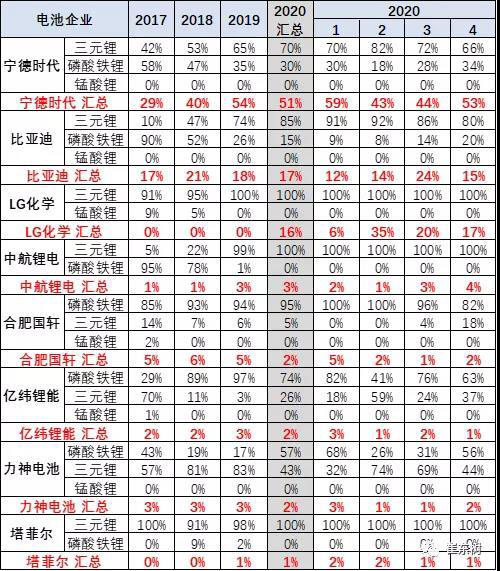 寧德時代的三元里的產(chǎn)量占比在快速提升中。尤其是寧德時代為代表2020年的三元鋰占比自身總量達到70%,2020年4月達到自身66%比例。