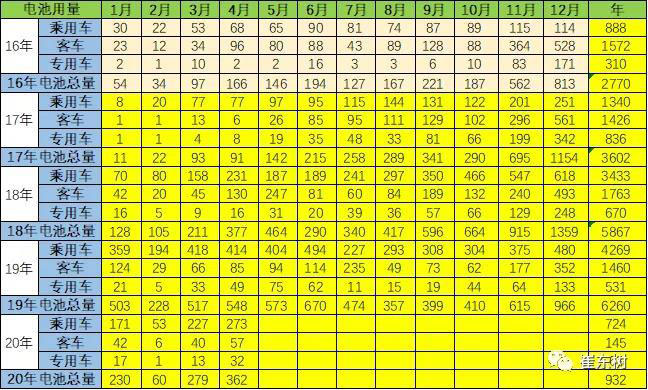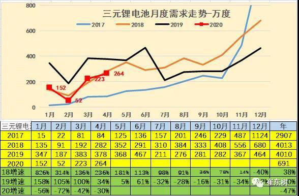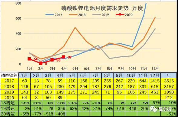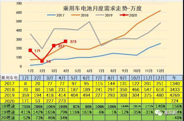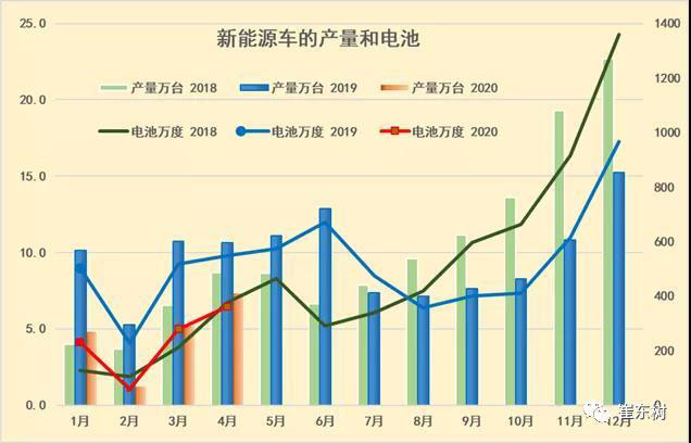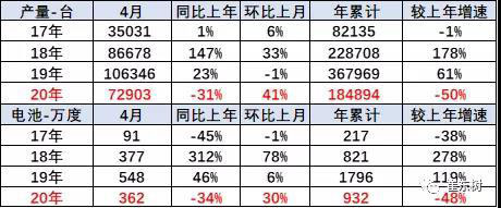 2020年4月的電池需求362萬度,大幅低于2019年4月的電池548萬度需求,也稍低于2018年的4月產(chǎn)銷??紤]貼退坡前后的干擾因素,因此2020年4月的電池需求還稍差。