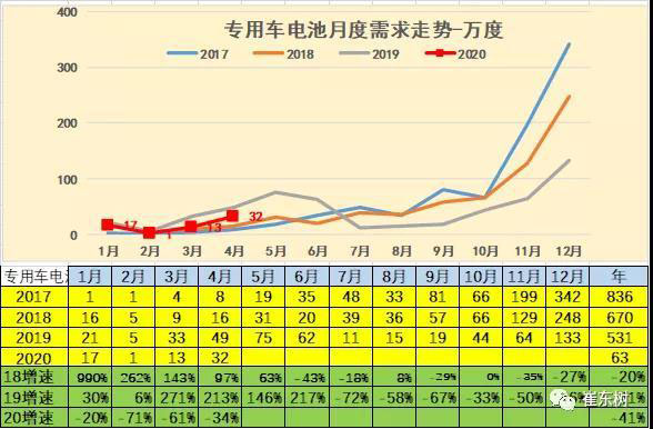 2020年初專用車用電需求增長較猛,隨后下滑較大。4月的專用車電池需求32萬度,較去年同期的49萬度大幅下降近34%。