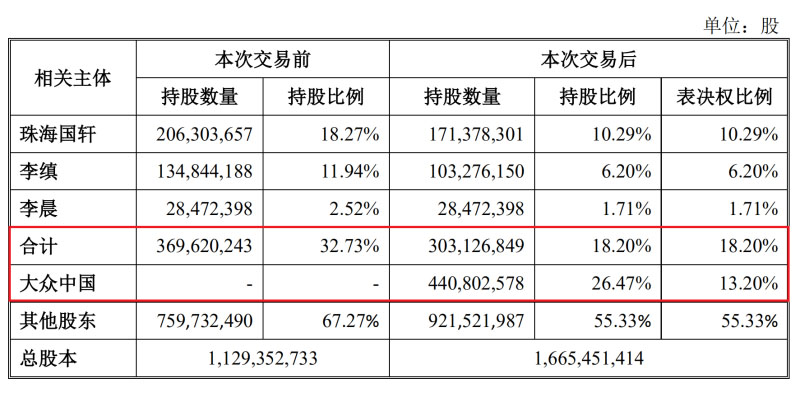 此次非公開發(fā)行和股份轉(zhuǎn)讓完成后,大眾中國(guó)將合計(jì)持有國(guó)軒高科4.41億股,占上市公司總股本的26.47%,為公司第一大股東;李縝及其一致行動(dòng)人將合計(jì)持有公司3.03億股,為公司第二大股東。