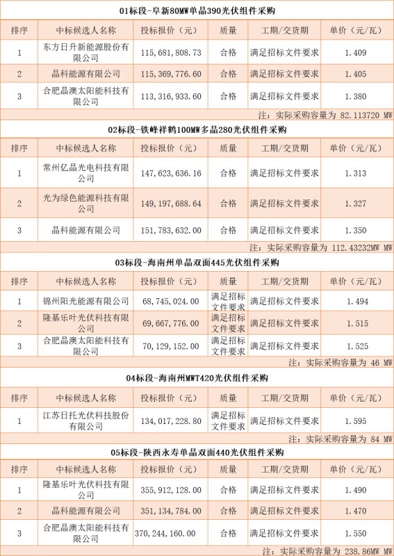 根據(jù)招標(biāo)公告供貨設(shè)備范圍要求,一標(biāo)段組件單塊功率為390W;二標(biāo)段組件單塊功率為280W;三標(biāo)段為高效型單晶光伏組,單板單面光伏組件(正面)功率為445W,背面功率不計(jì)入單塊組件功率;四標(biāo)段為84MW晶體硅太陽(yáng)能光伏組件,組件單塊功率為420W;五標(biāo)段單板單面光伏組件(正面)功率為440W,背面功率不計(jì)入單塊組件功率。值得強(qiáng)調(diào)的是,五個(gè)標(biāo)段要求正偏差0-5W。