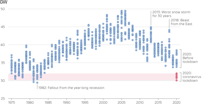 英國(guó)3月份全部工作日每日平均電力需求急速下降