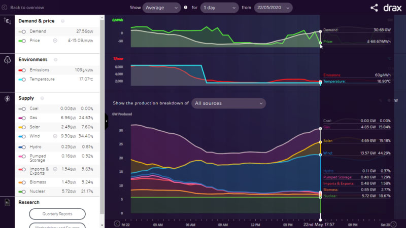 英國(guó)公用事業(yè)公司Drax旗下電力監(jiān)測(cè)系統(tǒng)Electric Insights數(shù)據(jù)顯示,在上個(gè)周末(5月23日至24日)前,英國(guó)電力部門(mén)的負(fù)電價(jià)和二氧化碳排放雙雙創(chuàng)下歷史新低。