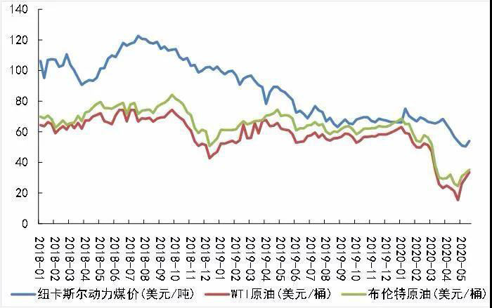 國(guó)際煤炭需求有所好轉(zhuǎn),5月以來煤價(jià)逐步回升,但仍處于較低水平。受中國(guó)及歐美地區(qū)逐步復(fù)工復(fù)產(chǎn)及OPEC+國(guó)家5月開始執(zhí)行減產(chǎn)協(xié)議影響,國(guó)際油價(jià)止跌回升,但仍保持低位波動(dòng)。