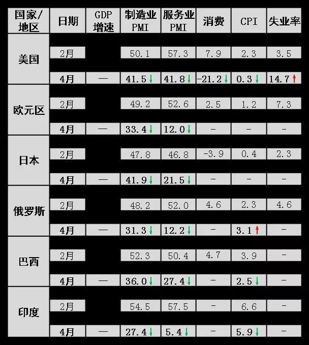 新冠肺炎疫情對(duì)全球服務(wù)業(yè)和消費(fèi)產(chǎn)生較大沖擊。主要發(fā)達(dá)經(jīng)濟(jì)體和新興市場(chǎng)增速均下降。美國(guó)制造業(yè)和服務(wù)業(yè)PMI均降至金融危機(jī)以來最低值,消費(fèi)萎縮程度遠(yuǎn)大于金融危機(jī),失業(yè)率飆升至有歷史記錄(1948年)以來最高值;歐元區(qū)和日本制造業(yè)PMI降至金融危機(jī)時(shí)期水平,服務(wù)業(yè)PMI所受沖擊大于金融危機(jī)。新興市場(chǎng)面臨經(jīng)濟(jì)深度衰退、債務(wù)風(fēng)險(xiǎn)、資本外流風(fēng)險(xiǎn)。
