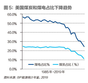 與美國煤炭和煤電占比不斷下降成為顯著對照,2005年以后,美國的天然氣和可再生能源消費(fèi)占比不斷提高。2019年美國煤炭地位發(fā)了歷史性的性的變化,降至11.3%,而可再生能源占比提高到11.4%。