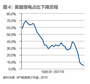 與減煤經(jīng)歷不同,英國的煤電減少走過先升后降的過程。上世紀(jì)50年代,英國為了治理散煤污染,煤炭涌向了燃煤發(fā)電,煤電在全部發(fā)電量的比重80年代末仍高達(dá)70%左右。1992年《聯(lián)合國氣候變化框架公約》簽署之后,要求發(fā)達(dá)國家率先減排二氧化碳等溫室氣體,煤電開啟了快速下降通道,到1999年,煤電占比從1989年的70%左右下降到30%。此后英國的煤電一直在30%上下,直到 2010年卡梅倫出任首相,大力推動(dòng)以非化石能源發(fā)電取代煤電,乃至天然氣發(fā)電。到2018年,英國煤電占比已經(jīng)從2011年的30%,下降到5%(詳見圖4)。