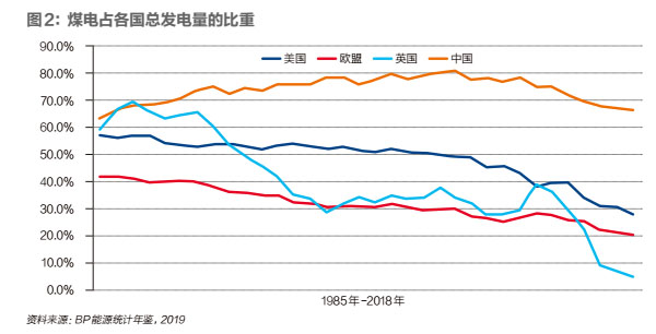 煤電而言,全球2018年煤電總發(fā)電量約10萬億千瓦時(shí),占全部發(fā)電量的比重為38%,其中中國煤炭發(fā)電量約為4.7萬億千瓦時(shí),占全球煤炭發(fā)電量的47%,不含中國全球煤炭發(fā)電量5.3萬億千瓦時(shí),煤電比重只有27%。號稱挺煤的美國,煤電的比重也從2005年50%以上,降低到2019年的25%,減少了25個(gè)百分點(diǎn)。比特朗普上臺(tái)前的2015年也減少5個(gè)百分點(diǎn)。歐盟煤電占比也從2005年的30%,降低到2019年的20%。英國從2009年宣布發(fā)展低碳經(jīng)濟(jì),逐步淘汰煤電,煤電占比已經(jīng)從2011年的30%左右,降低到2018年5%,2019年幾乎清零(詳見圖2)。