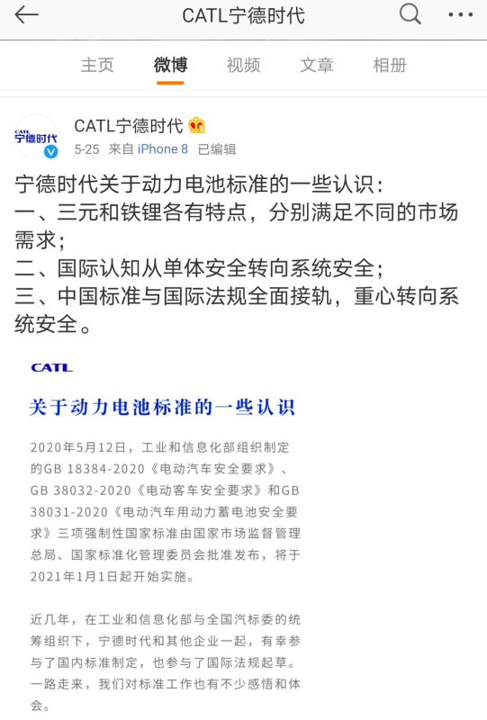 隨后,寧德時(shí)代在官方微博發(fā)布了《關(guān)于動(dòng)力電池標(biāo)準(zhǔn)的一些認(rèn)識(shí)》,內(nèi)容包括三元和鐵鋰電池分別滿(mǎn)足不同市場(chǎng)的需求;目前國(guó)際認(rèn)知從電池單體安全轉(zhuǎn)向電池系統(tǒng)安全;中國(guó)標(biāo)準(zhǔn)的重心在轉(zhuǎn)向電池系統(tǒng)安全等三點(diǎn)內(nèi)容。