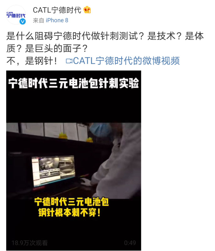 這兩句看似稀松平常的話(huà)被吃瓜群眾看作是對(duì)比亞迪的“隔空互懟”。三元鋰電池的安全問(wèn)題,本身就比較敏感。在雙方一來(lái)一回的“互懟”后,寧德時(shí)代為了自證三元鋰電池安全——證明三元鋰電池能夠通過(guò)針刺試驗(yàn),也發(fā)布視頻作為回應(yīng)。