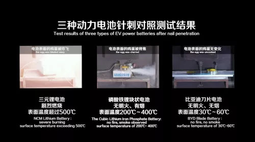 從針刺試驗(yàn)的結(jié)果來(lái)看,三元鋰電池出現(xiàn)劇烈燃燒,表明溫度超過(guò)500℃,電池表面的雞蛋直接被炸飛;傳統(tǒng)磷酸鐵鋰電池?zé)o明火產(chǎn)生,表面溫度達(dá)到了200~400℃,雞蛋被烤焦;比亞迪刀片電池沒(méi)有明火產(chǎn)生,溫度僅在30-60℃之間,雞蛋依舊完好如初。這場(chǎng)發(fā)布會(huì)成功讓消費(fèi)者記住了比亞迪刀片電池上完好無(wú)損的雞蛋,更收獲了刀片電池性能安全的好印象。